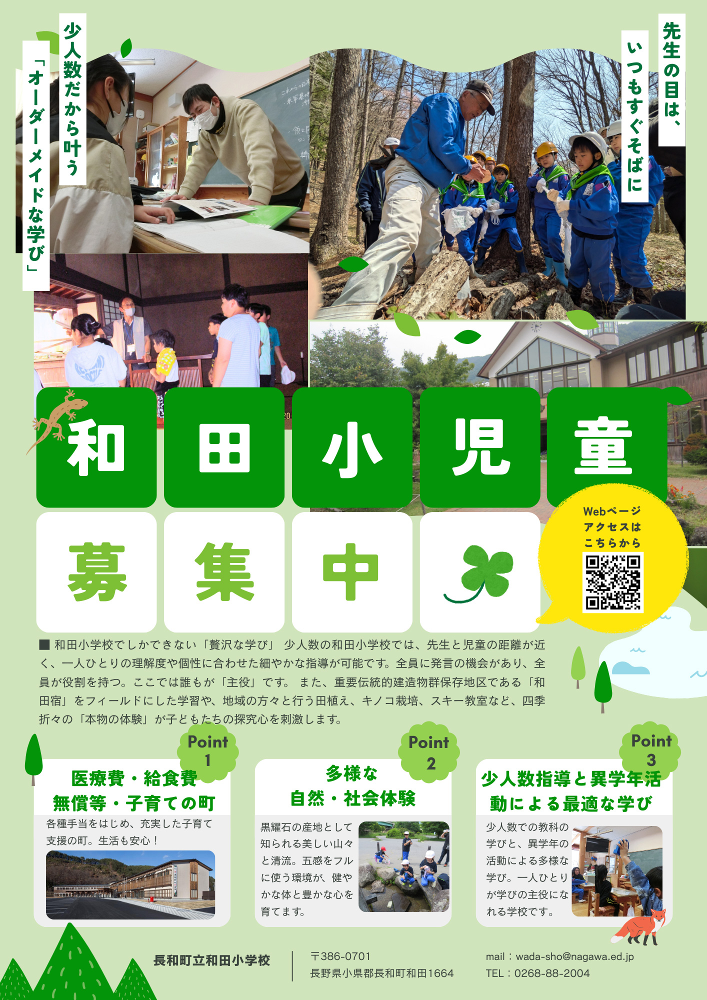 児童募集中! クリックで拡大表示します! 学校紹介 学校教育目標と経営方針 学校の概要・沿革 校章・校歌 グランドデザイン アクセス いじめ防止基本方針 お知らせ 行事予定表 学校だより 和田小学校写真館 学校からお知らせ 🍱 学校の様子が届きました!新年度の給食&学習スタート 🧹【地域に感謝】令和8年度 見守り隊紹介式&歩行訓練を行いました 🎒✨🌸 令和8年度 入学式:3名の新しい仲間を迎えました✨🌸【令和8年度始業式】「なかよく・かしこく・たくましく」を目指して✨🌸 令和7年度 3学期終業式 📖✨ 【投稿を全て表示】