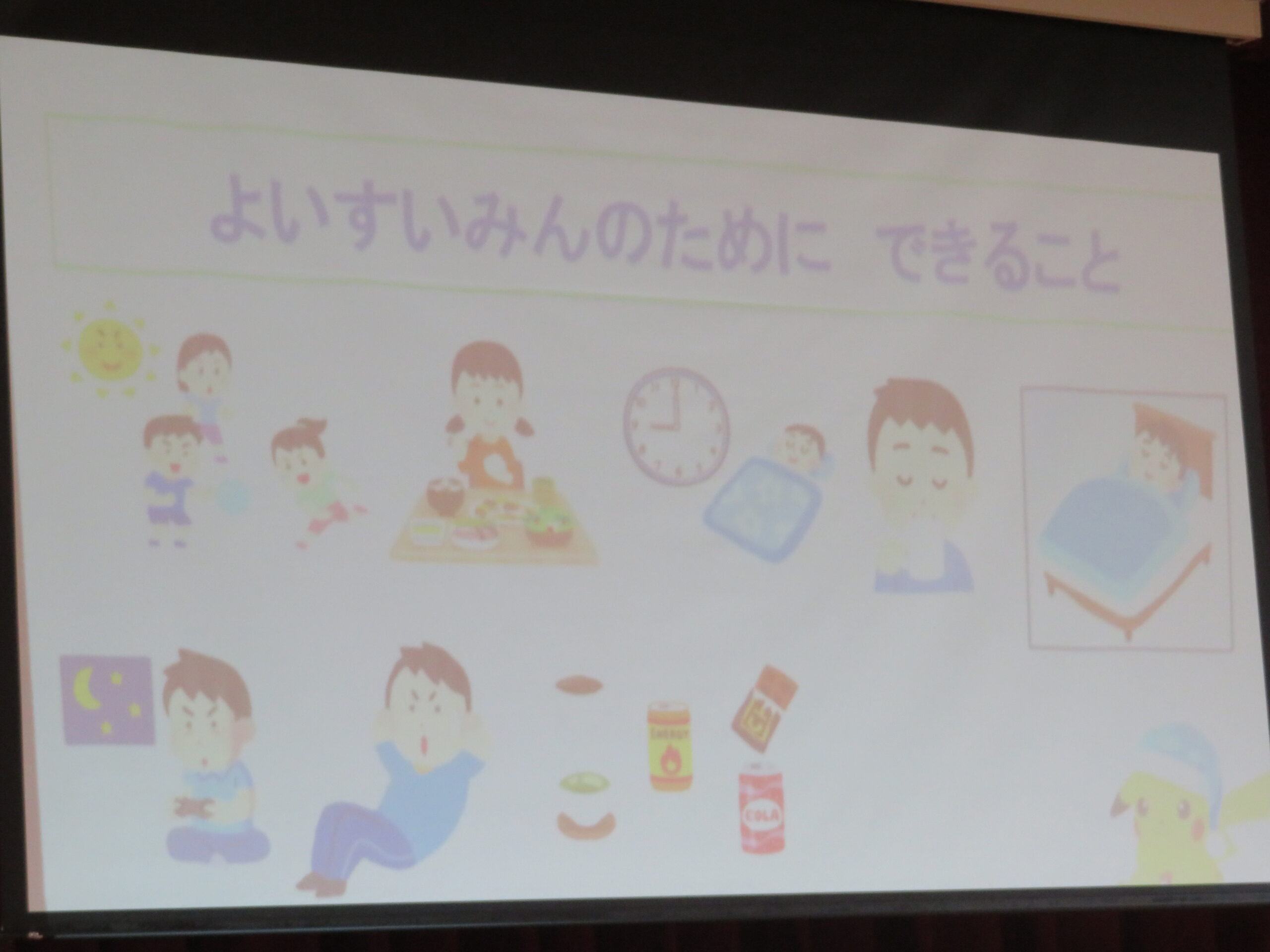 今回のテーマは「睡眠」です。学習や活動で自分の力を最大限に発揮するためには、適切な休息をとることが不可欠です。質の良い睡眠を十分にとるためのポイントとして、以下の内容をクイズ形式で楽しく学びました。