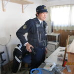 見学では、駐在所に勤務する警察官の方から、日々の仕事内容や身を守るための装備品について詳しくお話を伺いました。本物の装備品を間近で見せていただくと、その重みや性能に驚きの声が上がり、「地域を守る仕事」の責任感や大変さを肌で感じることができたようです。