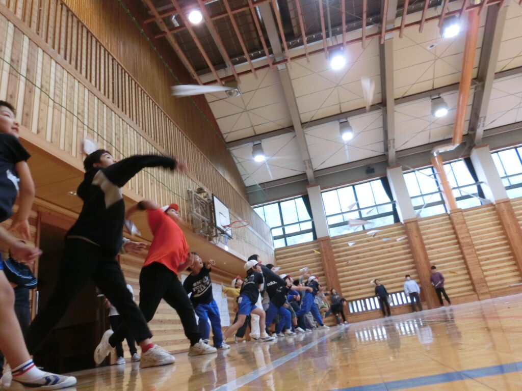 10月20日、「いきいきウィーク紙飛行機大会」が輝きの時間に体育館で開催されました。
