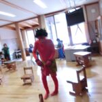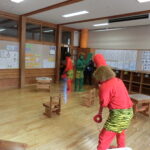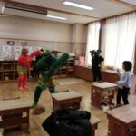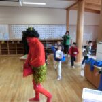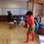 3時間目、各教室に3体の大きな鬼が突如出現! 子どもたちは「こわーい!」「きゃー!」と驚きつつも、自分の中の「追い出したい鬼」を退治しようと、「鬼は外!」と元気いっぱいに豆をまいていました。