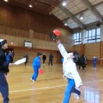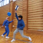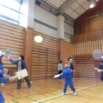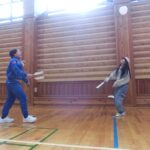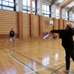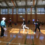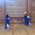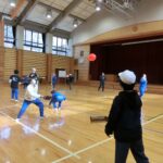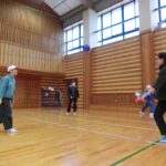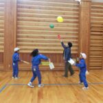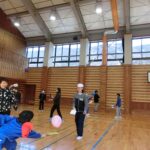 活動は「なかよし班」のペアで行われました。 初心者でもラリーが続くように、アルミホイル製の羽根だけでなく風船も用意され、それぞれのペアに合ったスタイルで羽根つきを満喫していました。